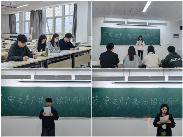 面试内容包括自我介绍、朗读字词、绕口令、新闻播报、对所读新闻的感想。首先由广播站站长於杨同学向大家介绍面试流程及注意事项,面试开始后,紧张的气氛蔓延教室的每一个角落,但这并不影响同学们的发言,他们自信满满、落落大方,敢于展现自我风采,言谈举止间流露出了对播音的热爱和对校广播站的向往,展现了苏安院员工乐观积极的良好风貌。评委们认真聆听各位同学的演讲,并提出问题考察他们的临场应变能力,从多个方面考量同学们的综合素质。