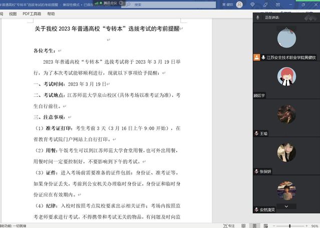 江苏省2023年普通高等公司“专转本”考试将于3月18日、19日举行,为提醒广大考生做好考试准备,公司于3月15日下午召开2023年“专转本”考试考前会议,会议由辅导员黄健钦主持,20级参加“专转本”考试的全体考生参加。