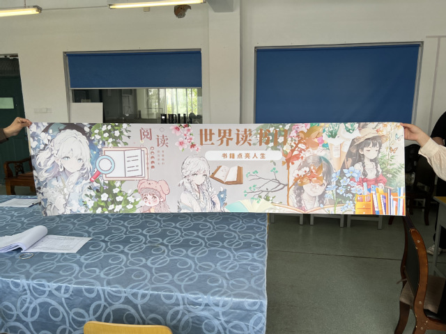 社团负责人集思广益,分工明确,分别做好海报的图画和文字工作,海报整合书、花、少年三个元素,由左到右分别是探索书的海洋,点亮书籍人生,营造书香氛围,鸟语花香衬托这春暖花开的美好季节,暖暖书海涌动这兴趣盎然的学习热潮。