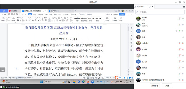 会议传达了《教育部教师工作司关于报送专项整治“清朗净化”行动有关情况的通知》,学习《省教育厅关于开展师德集中学习教育的通知》和省教育厅全省高质量教育人才队伍建设暨师德师风工作推进会的会议精神,通报了教育部公开曝光的33起违反高校教师职业行为十项准则典型案例。