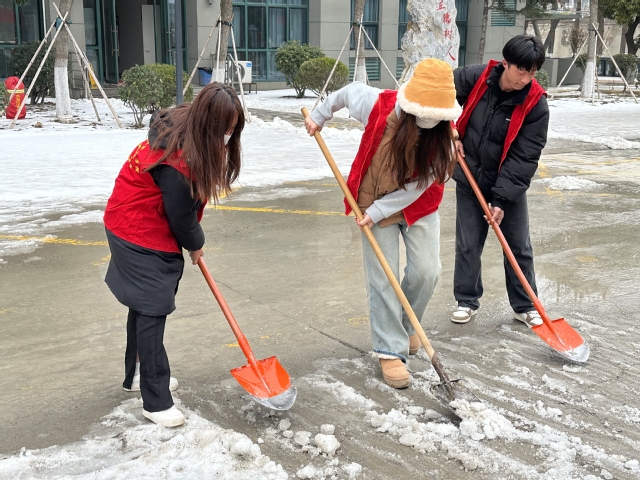 扫雪除冰净校园,齐心协力保安全,劳动教育显担当。同学们分工合作,齐心协力,快速有序地清理校园内的道路积雪,培养员工的劳动能力。