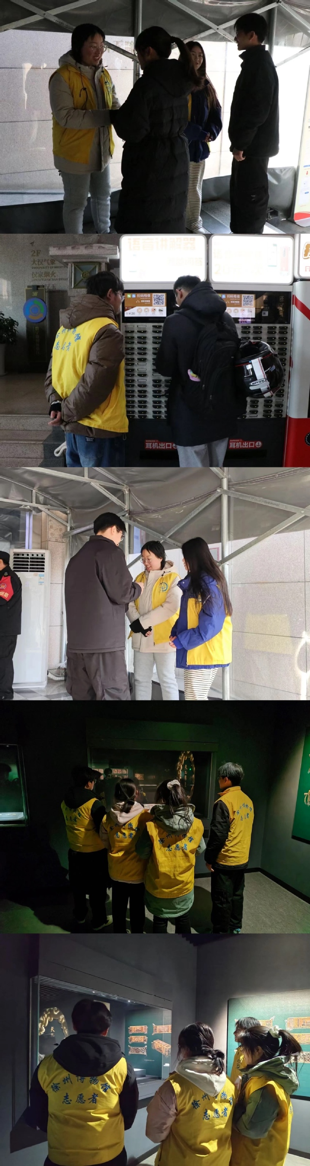 同学们踏入徐州博物馆后,迅速化身为文化使者,以志愿者的身份活跃在馆内各处。他们引导游客有序参观,耐心解答疑问,以热忱与专业为游客们开启非遗探索之旅。