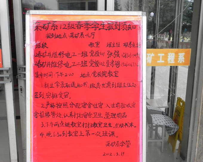 2012年3月19日,采矿系迎接2012春季新生报到工作正式开始。 迎新现场人头攒动,报到点、交费点前都挤满了家长和前来报到的新生。虽然人多拥挤,但是秩序井然,新来的同学在迎新同学的帮助下,快捷地完成了报到、交费等一系列步骤。 据了解,为使整个迎新工作顺利进行,我系学管自3月上旬便开始了筹备工作,筹备组要求每个工作人员要做到:一、在思想上重视,参与迎接新生的全体成员要积极为新生服务,力求使我系各个环节的工作做到最好,在新生及其家长中留下美好的印象。二、将以人为本的思想实践于整个迎新活动,为新生前来报到提供方便快捷的途径。同时采矿系还挑选专人值班,以应对各种非常情况发生。 截止到记者发稿,整个迎新活动进展顺利,此次采矿系迎接新生65人左右,我系已经圆满地完成了迎新任务。