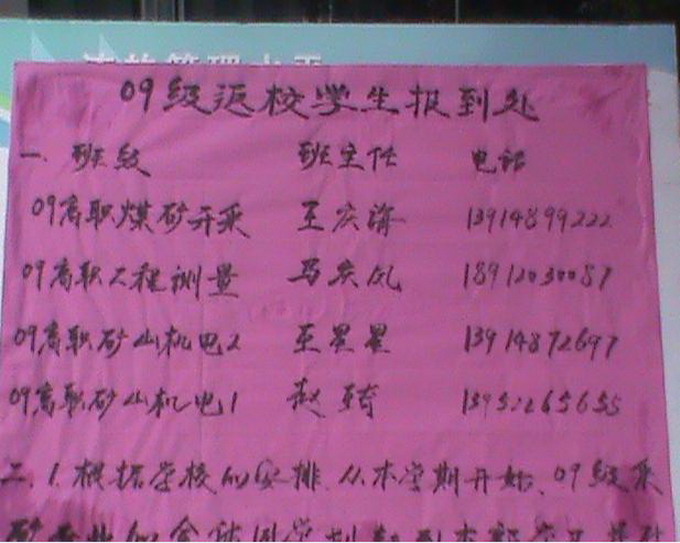 2010年8月30日,采矿系迎接第三批次员工报到工作正式开始。此次返校的是09级的老生。其中包括云龙校区返校的4个09级高职班,它们分别是09高职煤矿开采班、09高职工程测量班、09高职矿山机电1班和09高职矿山机电2班。