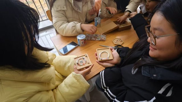 在“同心鼓” 游戏中,心理委员们5人一组,每人手持一线,齐心协力,各小组争分夺秒,活动极大地增强了彼此间的信任与团队协作精神;在“DIY手链” 环节,大家集思广益,根据各自的喜好制作了属于自己的专属手链;此外,活动中,心理委员们自由表达内心想法,并互相分享解读,促进了成员间的深度交流与情感共鸣。