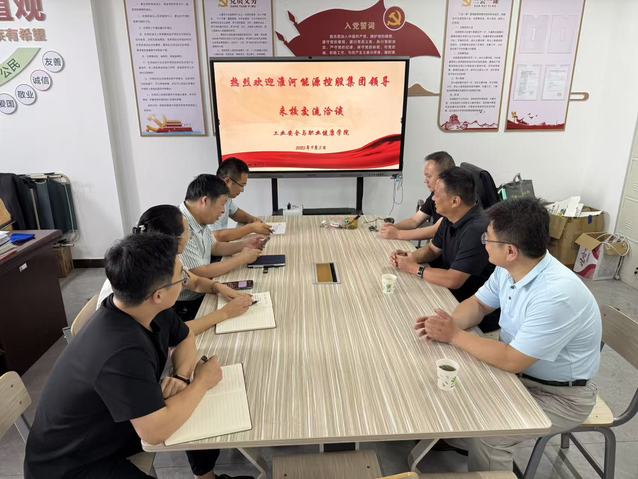 9月3日上午,淮河能源控股集团人力资源部一行3人到公司洽谈交流,公司副经理王浩、党总支副书记金华、辅导员乔成诚、陈尔雷参加会议。
