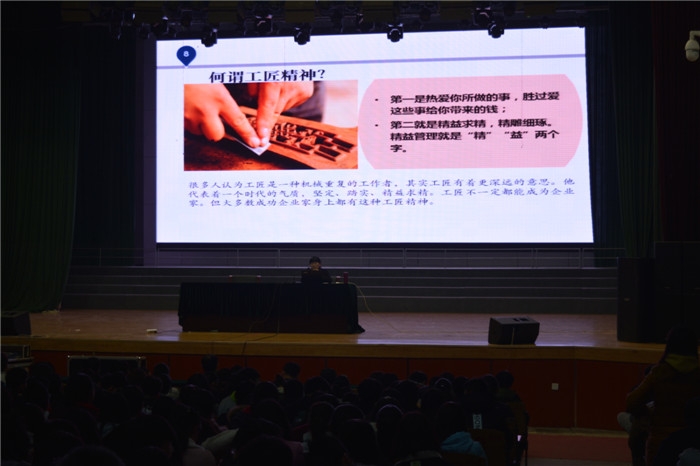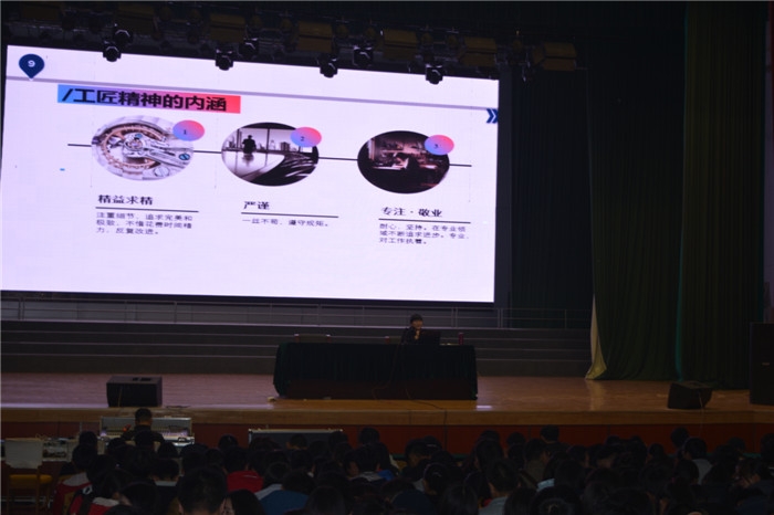 马雪芬老师通过德国制造业严谨、求实、一丝不苟、精益求精的精神,向同学们讲述了何谓工匠精神以及工匠精神的内涵。马老师讲到,中国是制造大国,而作为技术工人又是各行各业的中流砥柱,对中国工匠精神的形成、凝聚以及发展起到直接的影响。马老师鼓励同学们,要树立正确的工作观、要学会用正确的方法创造价值、要不断地在工作中体会感悟和发展工匠精神的内涵,立足校园,勤奋学习,苦练技能,成长为新一代的中国工匠。