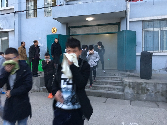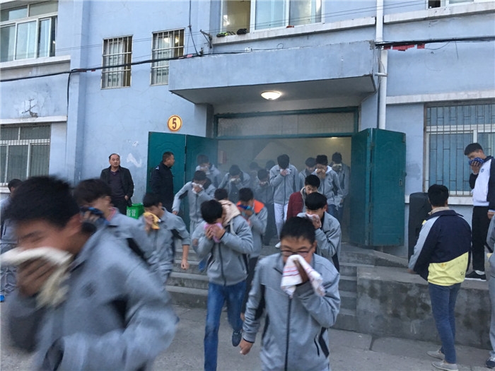 早上6:30分,校保卫处在5号楼内燃放了烟雾弹,模拟火灾现场,紧接着警报声响起,各楼层、各班级同学按照既定逃生路线,用湿毛巾掩住口鼻,有序、快速穿越浓烟进行疏散,用最短时间安全撤出宿舍楼,到宿舍楼前的篮球场上集合。整个演习过程中,全体同学都能严肃、认真地对待。