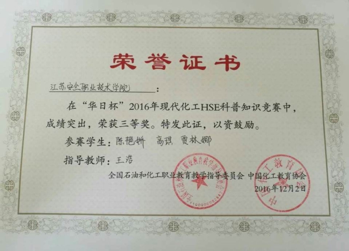 2016年12月2日,全国职业院校现代化工HSE科普知识竞赛在徐州工业职业技术公司举行,安全工程系主任李志浩、副主任王浩带领安全专业高琪、陈艳娇、贾林娜三名同学参加比赛。