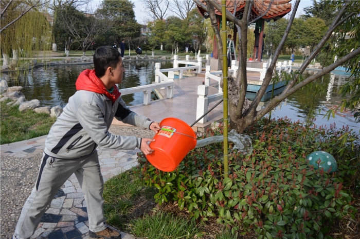 徐淮大地的春天最是干燥,为了能让“民族林”的树木在春天得到更好的生长,3月15日下午课外活动时间,安全工程系学雷锋服务队的同学们与16新疆班的部分同学带上水桶、盆等浇灌工具来到了休闲广场上的“民族林”,为树木浇水。同学们从广场上的喷泉池中拎水,一桶桶、一盆盆地浇灌树木。休闲广场上跃动着同学们穿梭的身影。有的同学衣服被被水打湿了,有的同学鞋子沾上了泥浆,但无论是新疆班还是内地班的同学们浑然不顾,依然忘我地忙碌着。