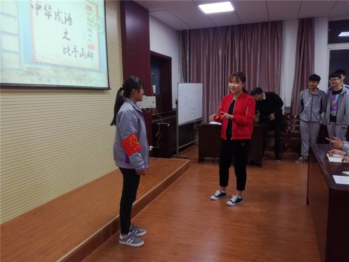 为了办好此次活动,安全系学管提前给各班级同学印发了《中华成语精选读本》,同学们利用早读及课余时间进行朗读、背诵,为成语大赛做准备。比赛分为预赛和决赛两个环节,每班选派六名同学参加,选手通过自由组合,两人一组。每组一人比划另一人通过队友的肢体动作来猜成语。比划过程中猜词者回避,其他人可以观看比赛成语,每组共猜词五个,每词限时一分钟,猜对加两分,猜错、超时不加分。比赛过程中,有的同学比划动作诙谐搞笑,惹得同学们捧腹大笑。有的同学们比划的模棱两可、似是而非,惹得场上搭档同学们抓耳挠腮,摸不清头脑;场下亲友团心急如焚、欲言又止干着急。连续多日,比赛现场同学们都情绪高涨,其乐融融。