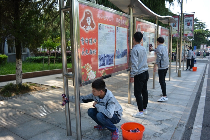 5月4日青年节,安全工程系学雷锋志愿者们利用课外活动时间,自发地组织起学雷锋义务劳动。同学们带上水桶、抹布等清洁工具,来到校园主干道为宣传画廊、灯箱牌匾进行大扫除。同学们用打来清水,用抹布反复地擦拭着宣传画廊和灯箱牌匾上的玻璃、边框、底座、边角……不放过任何一个细节。有的同学头发散了,顾不得去撩;有的同学衣服溅上了污水,顾不得去清理;有的同学鞋子湿了,也置之不顾。劳动的场景热情高涨,奉献的喜悦充斥着同学们的心。