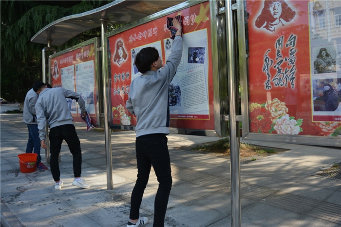 5月4日青年节,安全工程系学雷锋志愿者们利用课外活动时间,自发地组织起学雷锋义务劳动。同学们带上水桶、抹布等清洁工具,来到校园主干道为宣传画廊、灯箱牌匾进行大扫除。同学们用打来清水,用抹布反复地擦拭着宣传画廊和灯箱牌匾上的玻璃、边框、底座、边角……不放过任何一个细节。有的同学头发散了,顾不得去撩;有的同学衣服溅上了污水,顾不得去清理;有的同学鞋子湿了,也置之不顾。劳动的场景热情高涨,奉献的喜悦充斥着同学们的心。