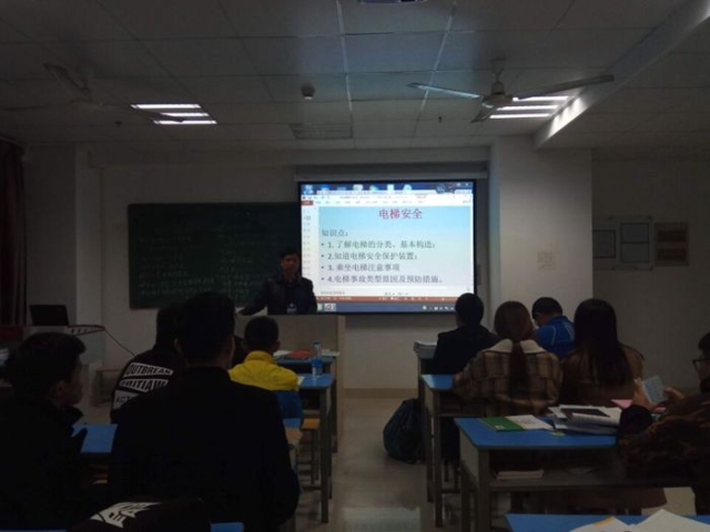 为切实加强员工对电梯安全知识的理解,熟知电梯使用的正确方法,提高员工电梯安全防患意识,保障员工在校期间的人身安全。2017年11月12日晚,安全工程系各班班主任利用晚自习时间对员工进行了关于《电梯安全知识》的专项讲座。
