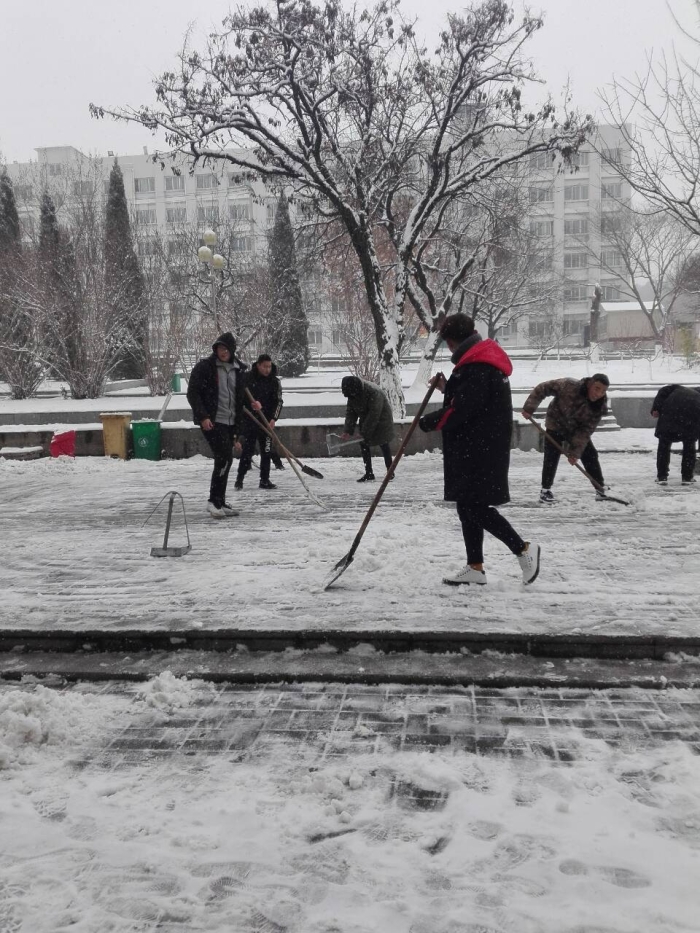 2018年的第一场雪使整个校园银装素裹,分外妖娆。但厚厚的积雪也使师生出行带来不便,为出行方便安全,1月4日中午,在全体老师没课的时间段,安全工程系全体党员、师生在支部书记李志浩带头和组织下进行了一次义务扫雪劳动。