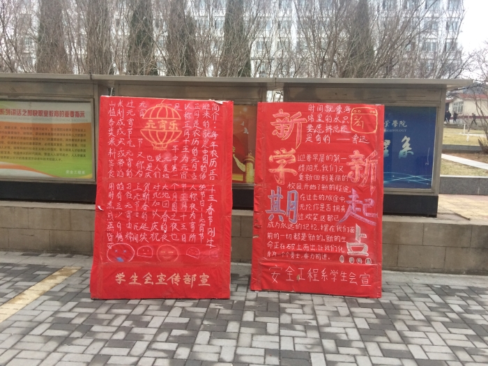迎着清晨第一缕灿漫的阳光,踏上新的学习旅程。为使同学摆脱在寒假中的懒散风气,积极进入到学习状态中,营造良好的校园氛围,充分展现新学期,新风貌。公司安全工程系员工会宣传部成员于2月27日下午13:00在系门口张贴了“新学期,新起点”宣传海报。