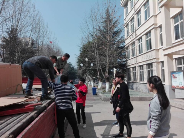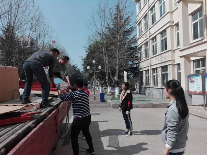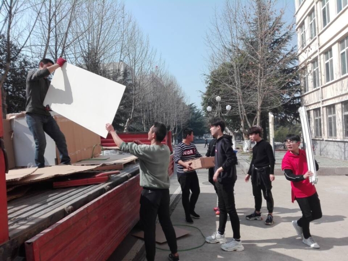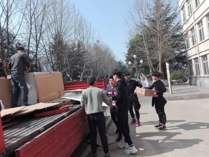 新的实验技术、实验仪器、实验方式、实验思想、实验项目要求购入或更新实验设备。3月12日上午,安全工程系化学分析实验室又进行了设备更新与装备。马岩岩博士指导下,16高职安全技术班的刘理、王梓明等十多位同学帮忙将卡车运来的实验设备小心搬进实验室。