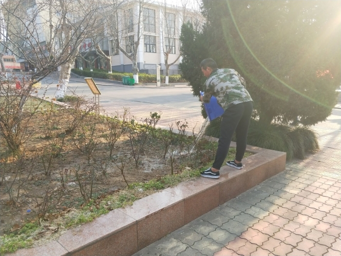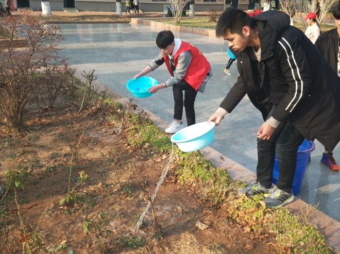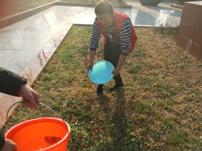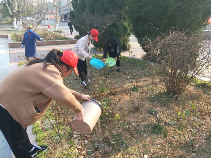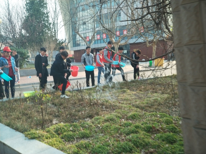 同学们在金主任的带领下有条不紊进行各项活动。校园里到处都是同学们忙碌的身影,同学们相互配合,有的为花坛里的树木花草浇水,有的清理花坛中的垃圾等。活动结束后,由记者团摄影部成员为植树活动的志愿者进行拍照留念。