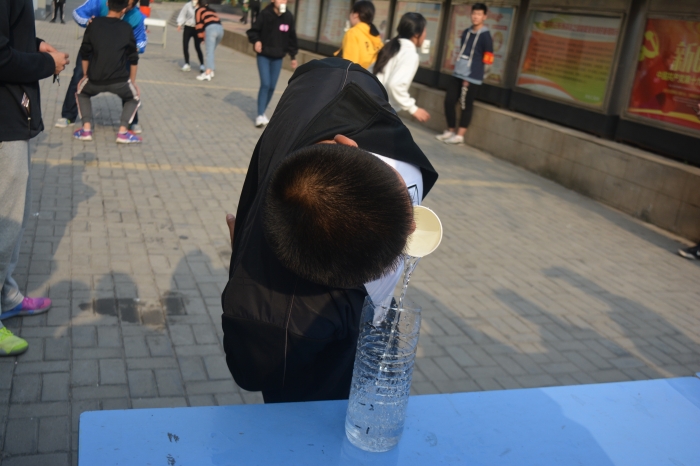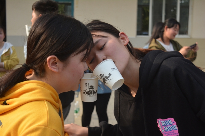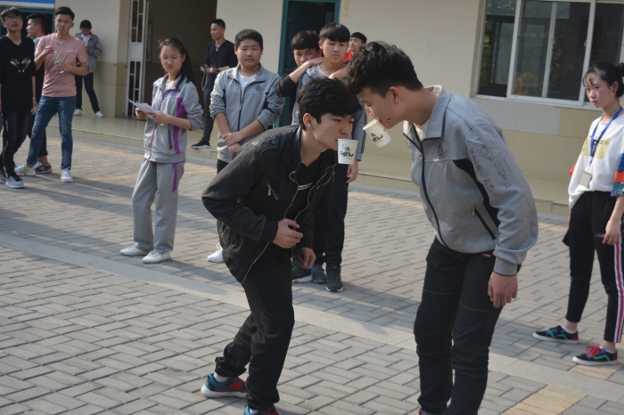 这次活动由我系每个班级选派十个人参与。参赛者用纸杯装满水,用嘴巴倒入另外一个人的用嘴唇咬住的杯子里头,一次五个人,到最后一个人倒入员工会同学准备好的大杯子里头,依次顺坏,总共三分钟时间,最后看那个组倒入杯子里水最多,就算那个组胜出。