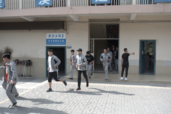 演练活动共分为两个部分:第一部分,警铃响起后,同学们在员工会及相关老师的组织下按照指定路线迅速撤离到安全区域。到达安全区域后,由各班长清点人数,演练共用时3 分05秒,达到预期效果。第二部分,钟老师先做了总结,然后由马主任向同学们讲解在火灾发生时如何正确逃生的相关问题。