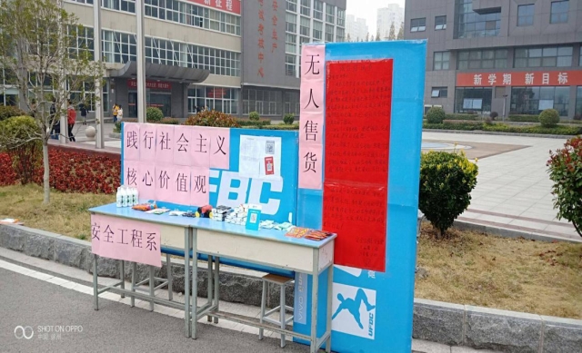 在全校上下齐心创建文明校园的重要时期,安全工程系按照党委关于校园文明创建的相关要求,认真践行社会主义核心价值观,特别是针对老员工的诚实诚信方面开展了实践活动。11月20日中午,安全系在云龙校区发起了诚信倡议书,并安放了一个无人售货摊位,摊位上摆放了暖手贴、面巾纸、创可贴、签字笔、护手霜等员工生活用品,并在旁边摆放了物品价目报和支付方式(微信支付和支付宝支付),无人看管的状态下物品购买全靠同学们自觉和诚信。整个过程持续9个小时,最终将所剩物品和售货金额对比后结果显示云龙校区老员工诚信度达到了90%以上。