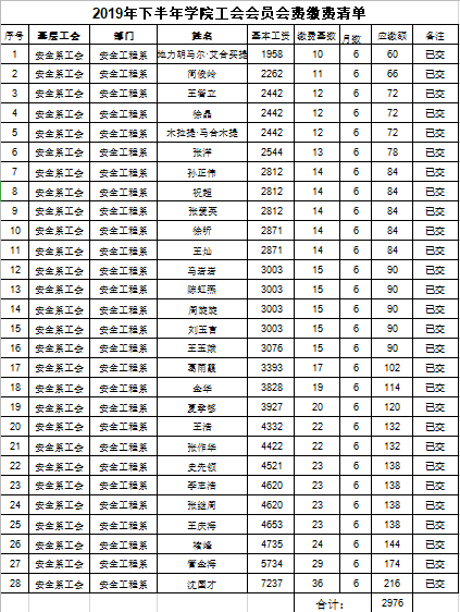 工会会费收缴是基层工会的一项重要工作,为使此项工作做到公开透明,我系按校工会要求将2019年下半年的会费收缴在部门工会公布,接受会员的监督。我系有会员28人,共收会费2976元。