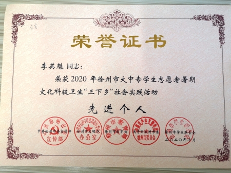 由中共徐州市委宣传部、徐州市文明办、徐州市教育局、共青团徐州市委级徐州市员工联合会共同表彰的2020年度全市大中专员工志愿者暑期文化科技卫生“三下乡”社会实践活动中,经过公司推荐、市级评选等环节,公司员工干部李英魁同学荣获徐州市“三下乡”社会实践先进个人。
