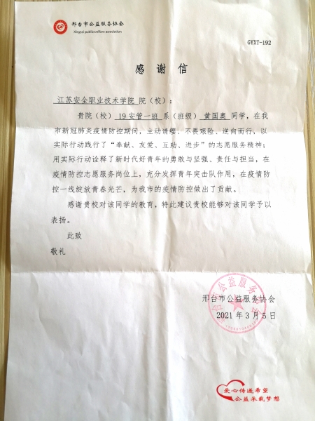 2021年3月中旬,XCSport云龙校区员工管理办公室收到来自邢台市公益服务协会的感谢信,感谢2019级安全技术与管理1班员工黄国奥在新冠肺炎疫情期间对邢台市疫情防控工作做出的贡献。