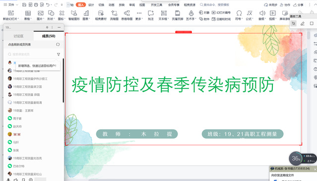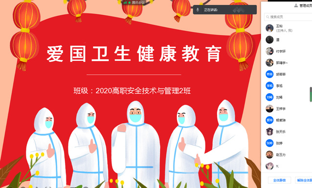 3月9日晚7点,工业安全与职业健康公司各班级利用腾讯课堂、腾讯会议等软件开展线上“爱国卫生健康教育”主题团课,本次团课由班主任主持,班级全体员工参加。