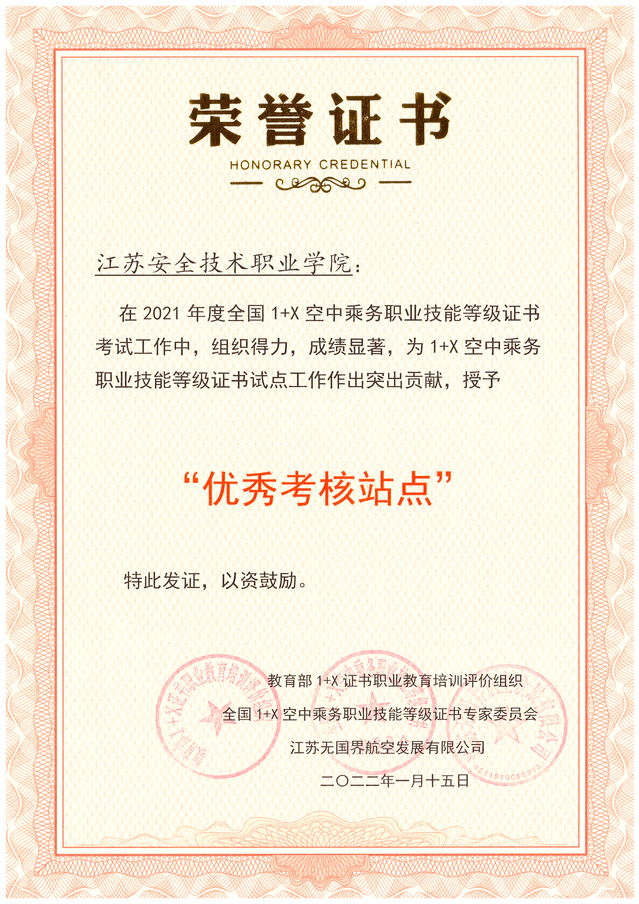 在教育部1+X证书职业教育培训评价组织、全国1+x空中乘务职业技能等级证书专家委员会和江苏无国界航空发展有限公司组织的2021年度全国1+X空中乘务职业技能等级证书考试工作中,公司组织得力,成绩显著,被评为“优秀考核站点”。