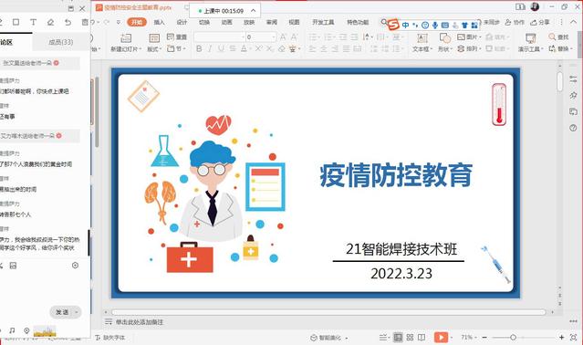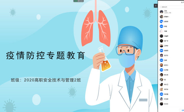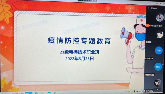 辅导员、班主任结合当前校园疫情防控工作做重点强调:坚持“日报告”制度,要求大家做到戴口罩、勤洗手、教室宿舍住地常通风、不聚集,坚持每日体温三测,关注疫情形势,不信谣、不传谣;严控员工外出,坚持“非必要不外出”原则,确需外出的,避免前往中高风险地区和有本土疫情的城市,并履行请假手续,如员工私自离校将严肃处理;积极接种疫苗,提高疫苗接种率,做到应接尽接,坚决杜绝瞒报、误报的严重违纪行为,一经发现,严肃处理;提醒学生非必要不网购,坚决防范物流疫情输入风险,同时倡导大家拒绝校外外卖,选择校园内餐食等。最后希望同学们严格要求自己,学习仍需内化于心,外化于行,培养学习主动性,增强自主学习的能力,适应网课新生活,专注当下,保持希望。