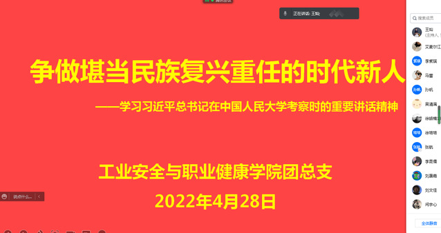4月27日下午,XCSport贾汪校区团总支组织各班级团支部书记、团总支成员线上集中学习习近平总书记在中国人民大学考察时的重要讲话精神,本次专题学习由团总支书记王灿主持。