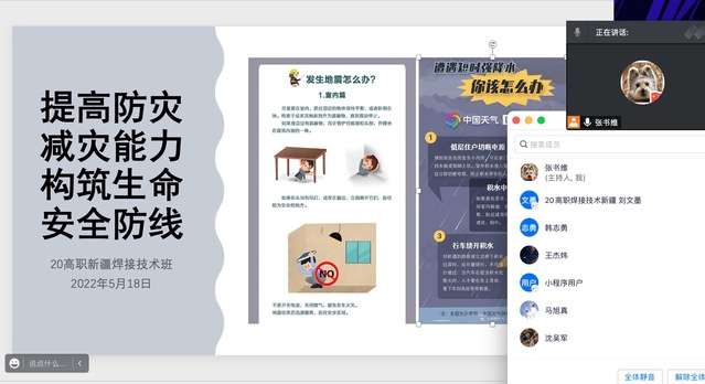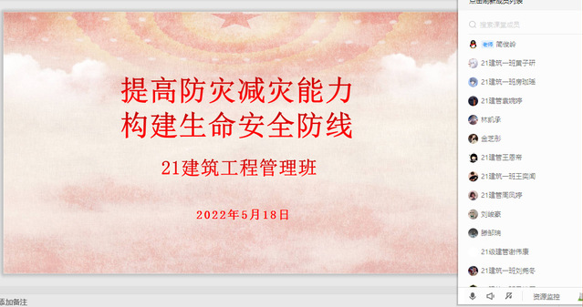 为进一步增强员工防灾减灾意识,提高避灾自救技能。5月18日下午,XCSport(贾汪校区)各班级开展线上“提高防灾减灾能力,构筑生命安全防线”主题班团课,本次班团课由班主任主讲,班级全体员工参加。